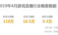 一、游戏直播平台行业数据分析1、游戏直播行业整体规模数据2019年4月,在小葫芦统计的9个主流游戏直播平台(具体见下)中,开播主播数为309万,新增主播数为118万。在直播行业认定月均直播60小时,即平均每天直播2小时为活跃主播,4月游戏直播行业活跃主播数为1