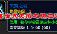 魔兽世界中9.0失落之魂的位置是在右边靠近中间一个上坡的顶上一个没有门的棚子里抓到的 ,失落之魂拾取后自动绑定,物品等级:1,使用效果:教你学会召唤这种小伙伴,需要等级:1至60。